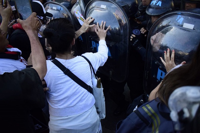 Sobre las 16, y ante la llegada de nuevos contingentes de manifestantes, las fuerzas represivas volvieron a su lugar de partida, detrás de las vallas que rodean el Congreso e impiden el libre tránsito de vehículos y personas.