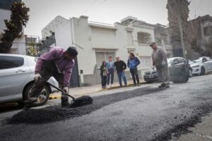 POR ENTRE NOS. La jefa comunal Mayra Mendoza supervisó esta mañana de lunes, trabajo de carpeta asfáltica, Los mismo se realizan en el marco del Plan Municipal de Bacheo.